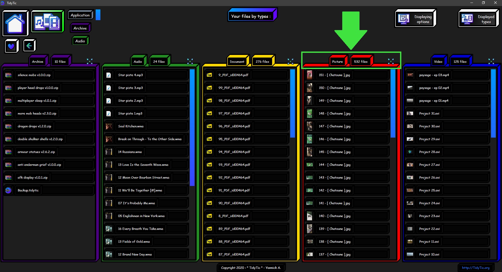 These two display modes will give you access to all tools available in TidyTic for modifying files in order for example to rename many files in a single action or modify the types of your files, customize the subtypes, tags etc.